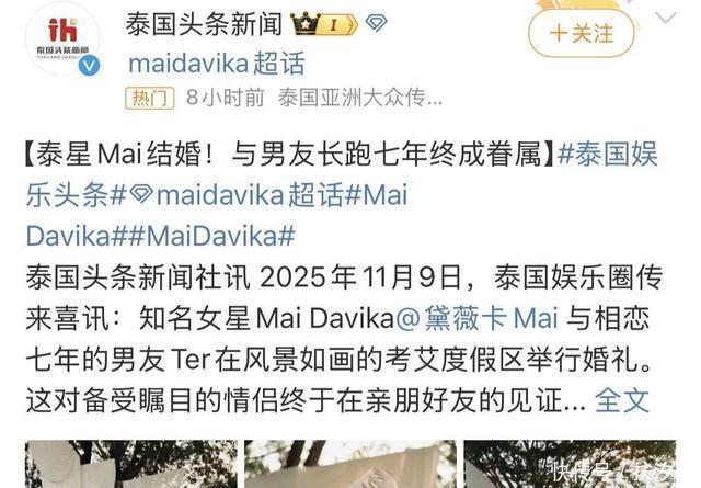 2024年黛薇卡参加《乘风破浪》时,就能让观众看出来,她真的一点都不争。这种斗争类节目压根不适合她,所以她也选择了退赛。 按照当时她的名气,继续参加下去,一定会收获更多的流量和中国粉丝。可是待黛薇卡压根不在乎,受不了高强度的训练,回到泰国“摆烂”去了。 现在她才33岁就已经结婚了,这要是在我国娱乐圈,不就是自断前程嘛!黛薇卡这还嫌结婚太晚呢,只能说比起事业她更想要一个家庭和婚姻。
